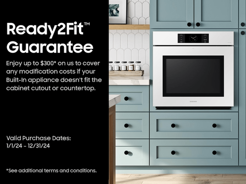Receive up to a $300 rebate toward a cabinet cutout or countertop modification if your new qualifying Samsung 30inch or 36inch Built-In Cooktop or Wall Oven does not fit your current Cooktop or Wall Oven cutout.