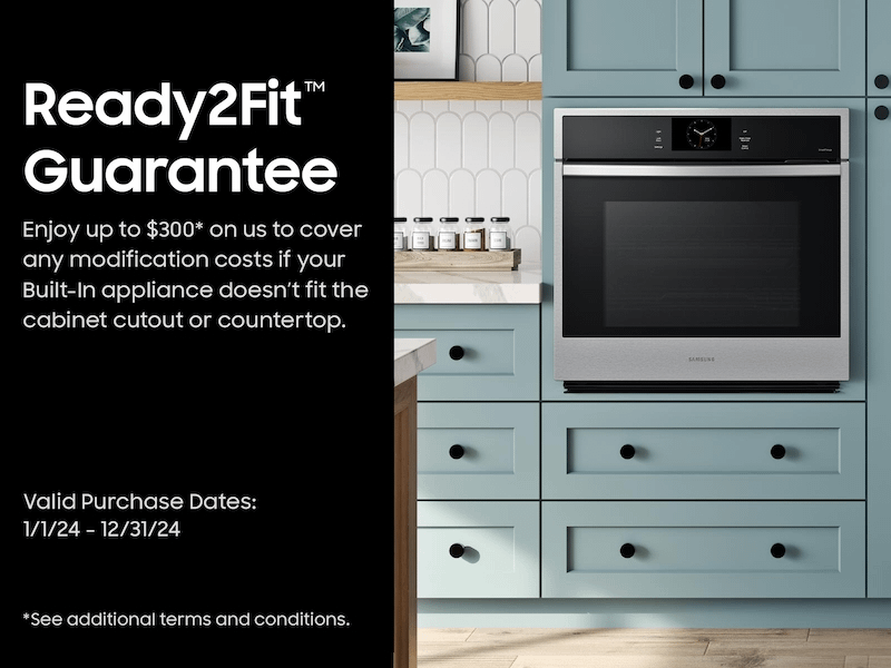 Receive up to a $300 rebate toward a cabinet cutout or countertop modification if your new qualifying Samsung 30inch or 36inch Built-In Cooktop or Wall Oven does not fit your current Cooktop or Wall Oven cutout.