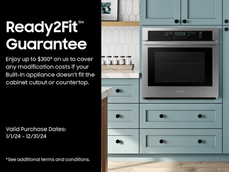 Receive up to a $300 rebate toward a cabinet cutout or countertop modification if your new qualifying Samsung 30inch or 36inch Built-In Cooktop or Wall Oven does not fit your current Cooktop or Wall Oven cutout.