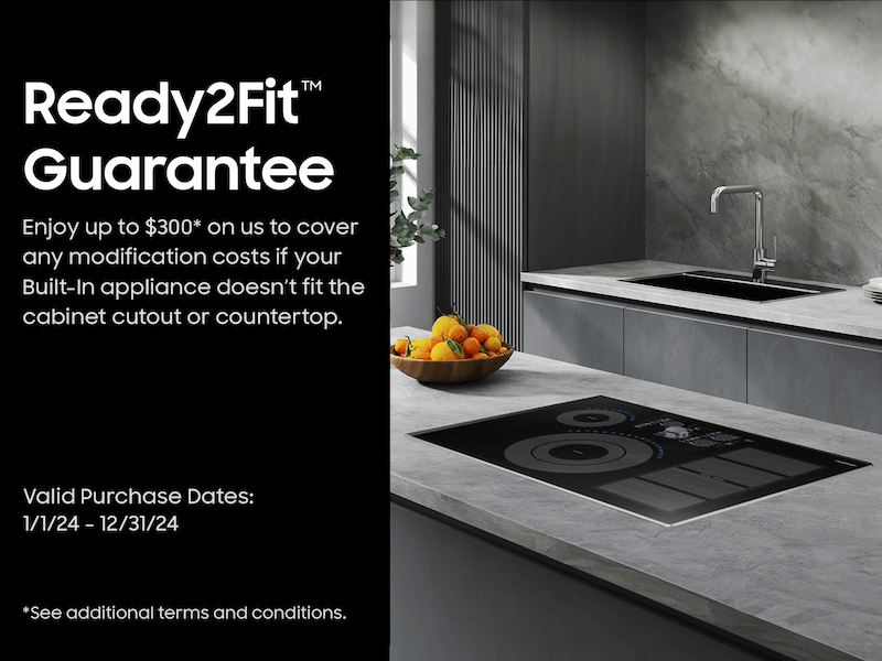 Receive up to a $300 rebate toward a cabinet cutout or countertop modification if your new qualifying Samsung 30inch or 36inch Built-In Cooktop or Wall Oven does not fit your current Cooktop or Wall Oven cutout.
