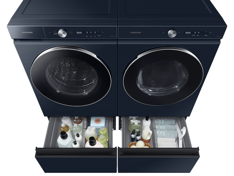 - Designed to pair with Samsung Bespoke Front Load washers and dryers, this 27" wide pedestal will allow you to lift your Bespoke washer or dryer by more than a foot for a more convenient height. It also provides an easily accessible built-in storage drawer, so you can tidy up your laundry space.