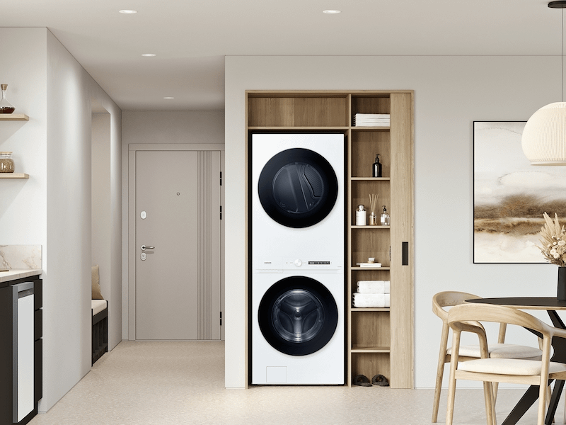 Upgrade to a stylish Bespoke AI Laundry Hub™ stacked washer and dryer. Featuring a clean flat-panel design, simple installation options, and easy to use controls.