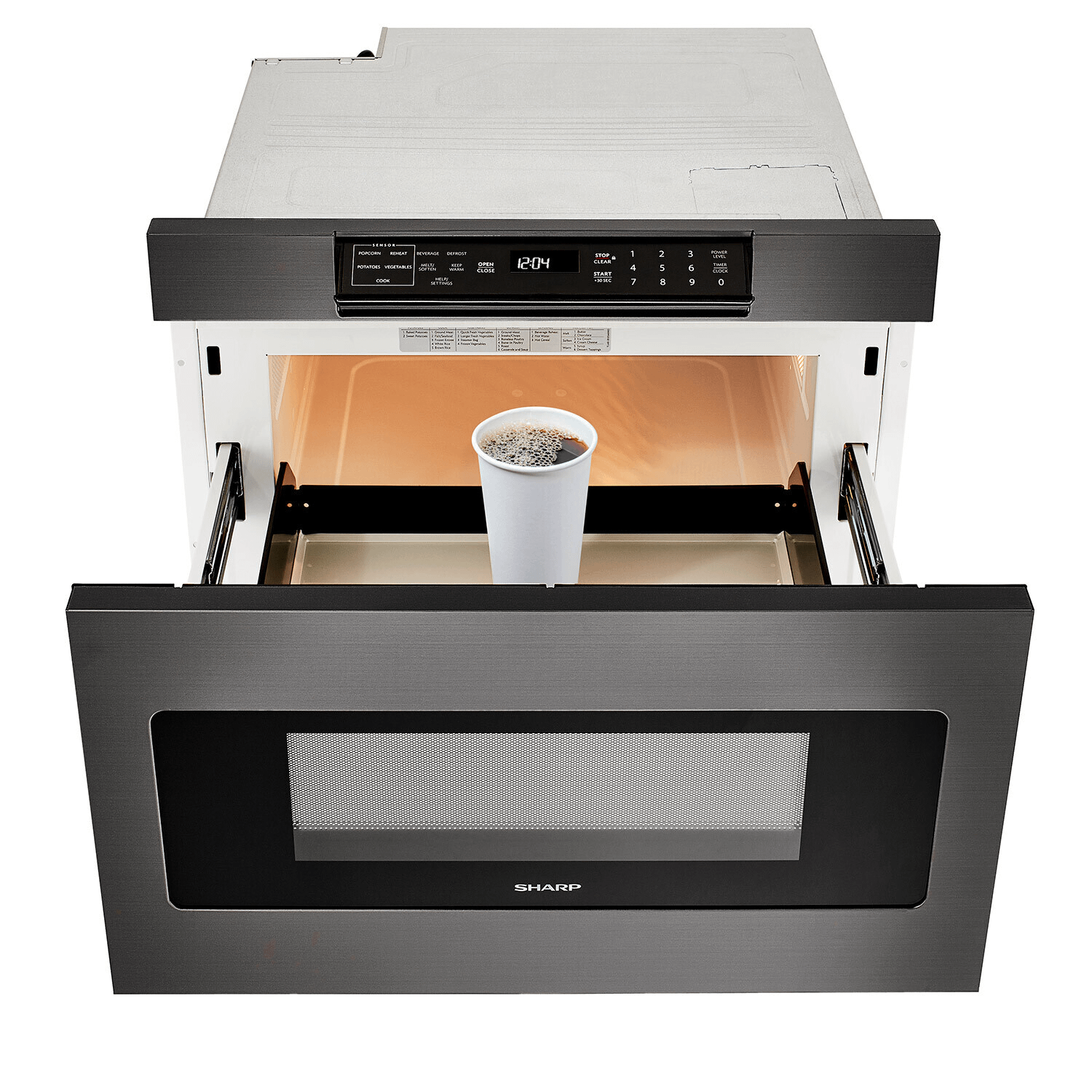 - The Sharp Microwave Drawer Oven boasts an easy-to-read display that disappears until you need it. The concealed control panel opens at a 45-degree angle, so it's easy to read and operate.