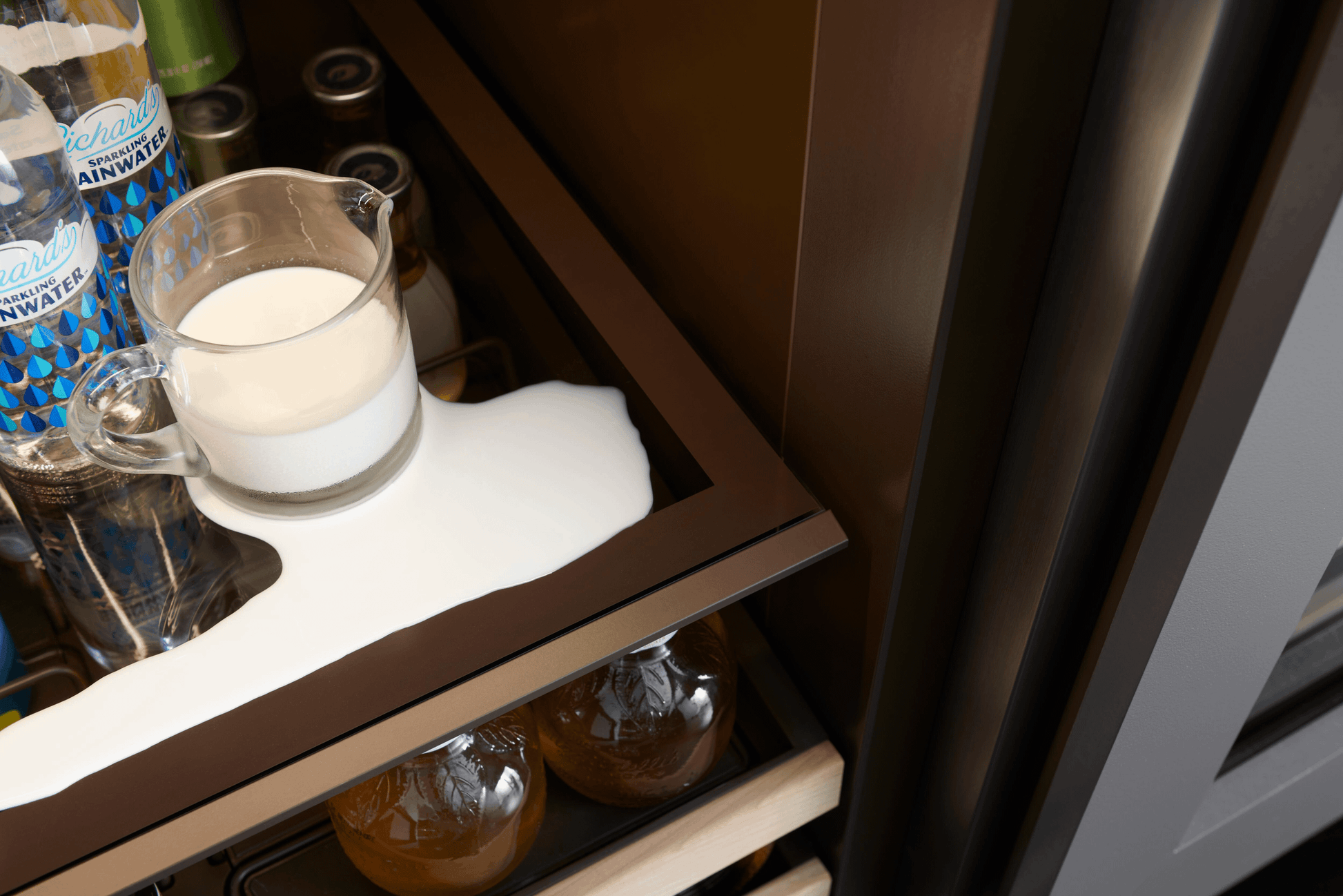 Nano coating lines the perimeter of each glass shelf to create a hydrophobic barrier that helps contain spills