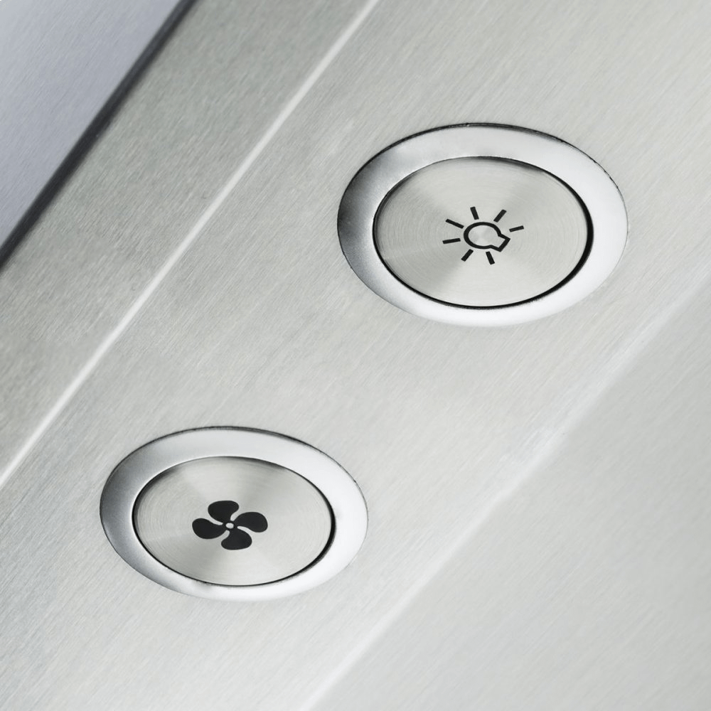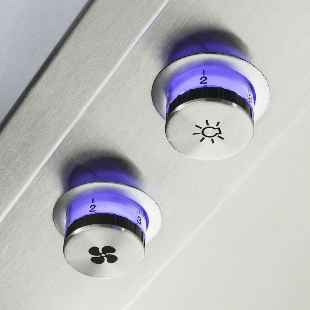 - Backlit LED knobs extend and illuminate to control lighting level and fan speed, then fully retract when not in use