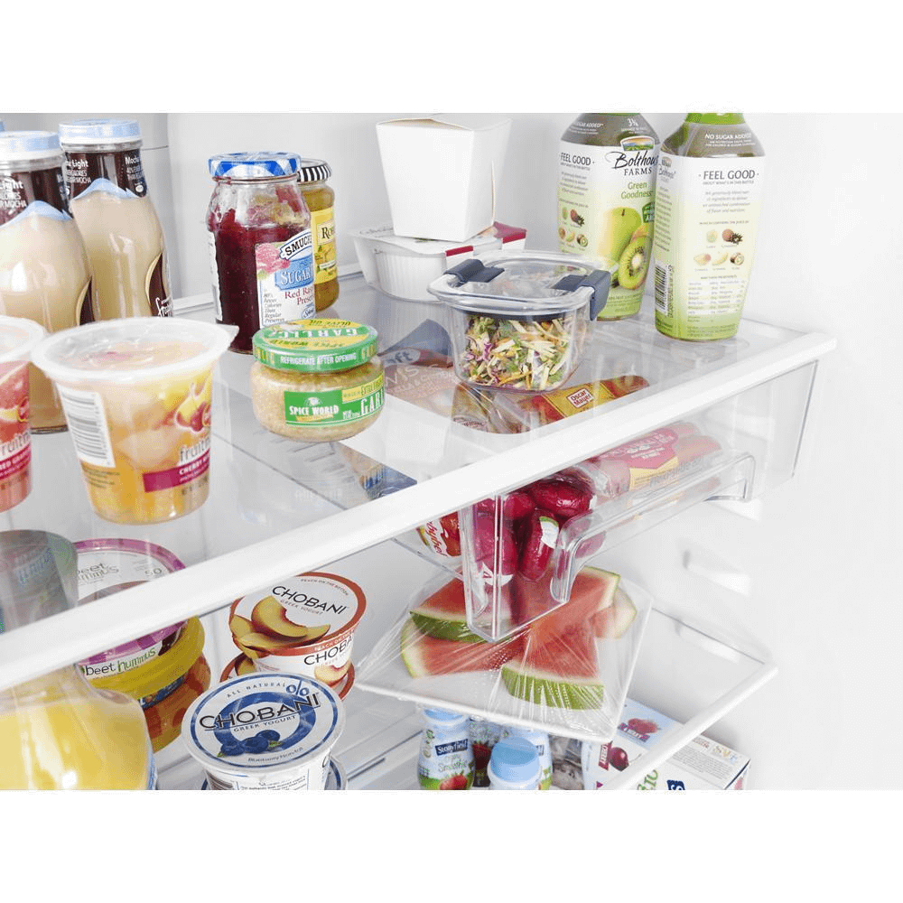 Get purposeful spaces that store more of your favorites. Our refrigerator with an optional icemaker (sold separately) lets you forget about filling ice trays. Fit more items on each shelf in this refrigerator with Frameless Glass Shelves and keep fruits and vegetables in their ideal environment with Humidity-Controlled Crispers. Plus, 19 Cu. Ft. Capacity gives you room for it all.