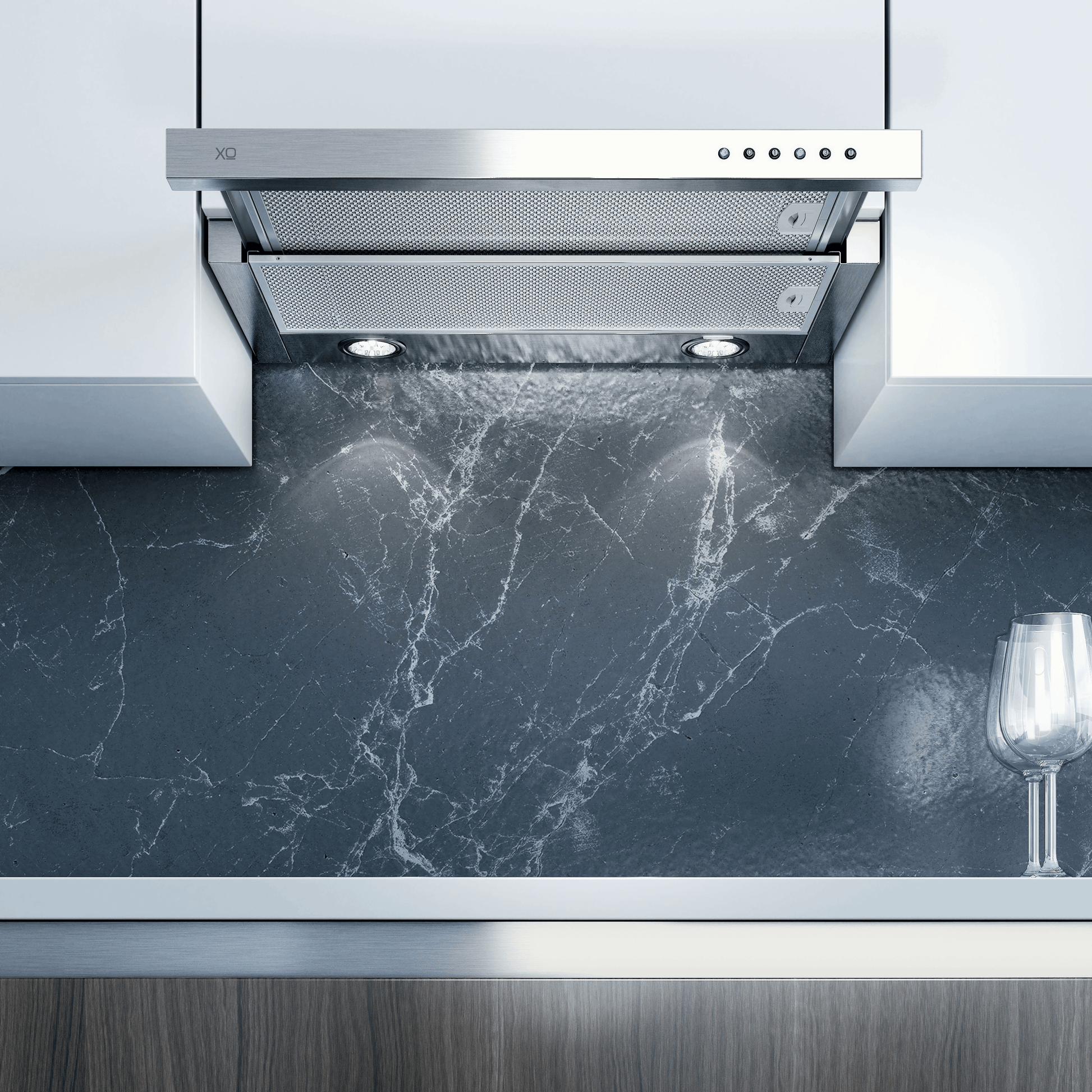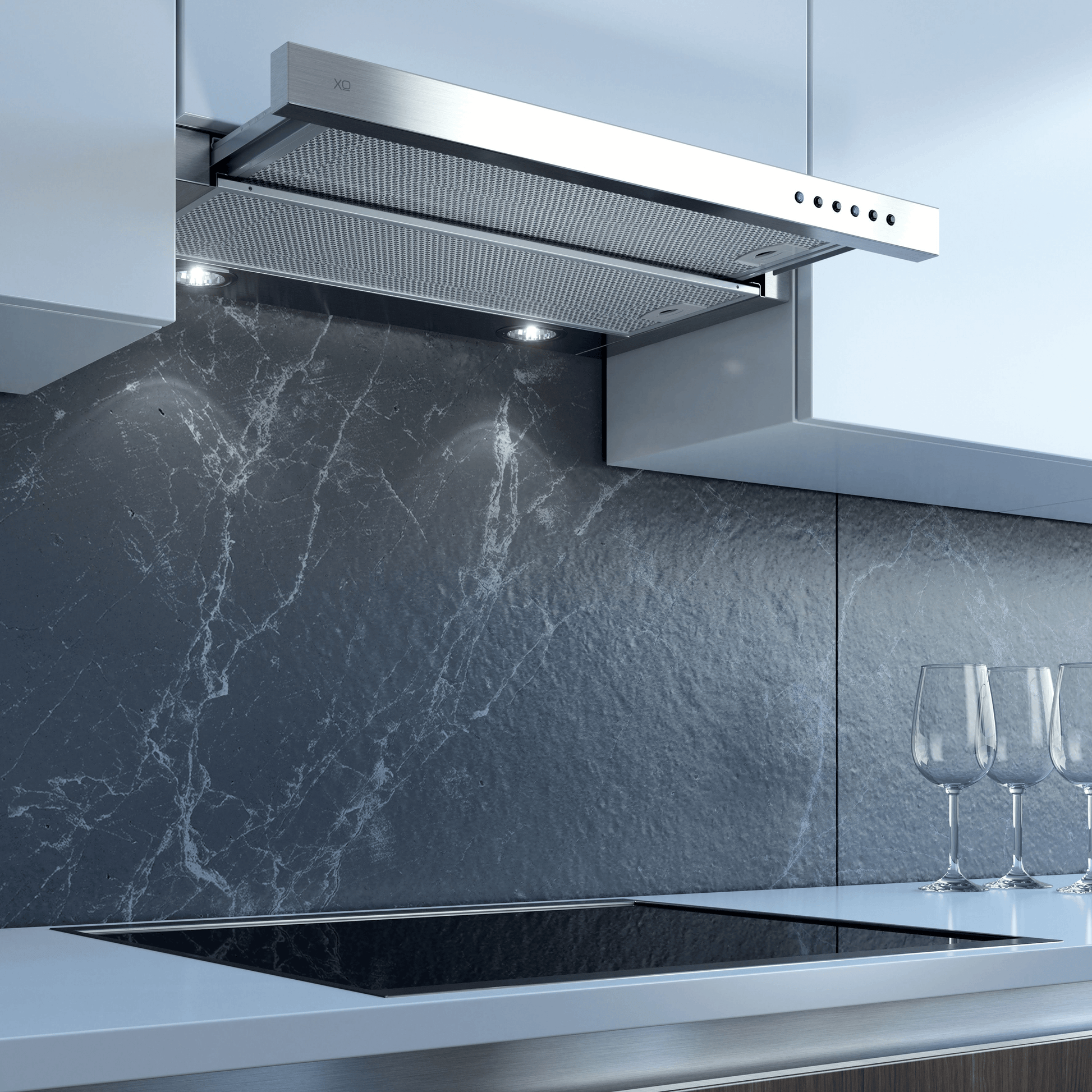 The XOC may look like other minimal profile range hoods but that is where the similarity ends. This powerful, versatile unit glides flush with your cabinets to reveal only a thin stainless steel band when closed but unlike other systems, the blower and lighting are fully functional with the filter visor open or shut.